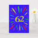 An explosive 62nd birthday card! What a wonderful way to send birthday greetings. The number 62 in bright yellow with an explosion of bright colours and stars.