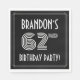 This elegant sixty-second birthday party/celebration paper napkin design features a custom name, an intricate art deco style inspired number “62nd”, the message “BIRTHDAY PARTY!”, and a multi-line border. It features a black-coloured background by default, but it can be customised to a different colour, if desired. Elegant birthday themed paper napkins like these might be used at a party celebrating somebody’s 62nd birthday. [~Z0000616]