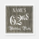 This elaborate and ornate birthday themed paper napkin design features a customisable name and the message “62nd Birthday Party”. The large number “62nd” and the words “Birthday Party” are in luxurious script-style text. The background features a faux/imitation woodgrain-inspired pattern. Fancy, luxurious paper napkins like this might be useful to have at a birthday celebration/party being held to celebrate somebody’s sixty second birthday. [~Z0000564]