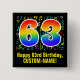 This fun, vibrant, and colourful birthday button design features a large number "63" with a rainbow spectrum gradient inspired pattern, along with the message "Happy 63rd Birthday,", and an editable name. Part of the background has a pattern of various music notes and symbols having a variety of colours and sizes. Buttons like this might be worn by the attendees at a birthday party being held to celebrate a musician’s, a singer’s, a song composer’s, or somebody else’s 63rd birthday. [~Z0000424]
