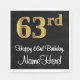 This elegant, sophisticated, and luxurious birthday themed paper napkin design features a large ordinal number “63rd” having a faux/imitation gold-inspired look, along with the birthday greeting message “Happy 63rd Birthday,” and an editable name in a script-style font. It also has a black-coloured background. Sophisticated birthday themed paper napkins like this might be used at a birthday party celebrating somebody’s 63rd birthday. [~Z0000516]