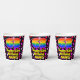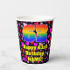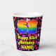 This colorful and cheerful birthday-themed paper cup design features a large number “63” with a rainbow spectrum gradient inspired pattern, along with the message “Happy 63rd Birthday,”, and a custom name. The background features a pattern of purple, pink, and red heart shapes. Joyful, fun paper cups like this might be fun to have at a birthday party/celebration being held to honor somebody’s sixty third birthday. [~Z0000548]