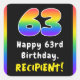 This vibrant and exciting birthday-themed square sticker design features a big number “63“ having a multicolor rainbow spectrum inspired gradient pattern, along with the message “Happy 63rd Birthday,”, and a customisable recipient name. Joyful birthday themed stickers like these might be used or distributed at a birthday party for somebody who is celebrating their sixty third birthday, or perhaps used when preparing gifts or invitations for such an event. [~Z0000630]