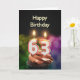 A birthday cup-cake with candles. The candles are made up of the number 63, for a 63rd birthday. A birthday card suitable for everybody.