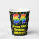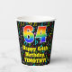 This fun and joyful music themed birthday paper cup design features a large number “64” having a rainbow spectrum gradient inspired pattern. It also features the message “Happy 64th Birthday,”, and a customisable name. The background features an exciting and colourful pattern of various music notes and symbols having a variety of sizes and colours. Vibrant, colourful paper cups like this might be fun to have at a birthday party being held to honour somebody’s 64th birthday. [~Z0000541]