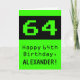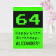 This nerdy and fun birthday greeting card design features a large green retro video gaming style number "64" on the front. It also features the birthday greeting message "Happy 64th Birthday,", and a name that can be edited. The inside features a customisable birthday greeting message, or could perhaps be cleared and left blank if a message is to be written by hand instead. A fun and nerdy birthday greeting card like this might be used to send a birthday greeting message in honour of the sixty fourth birthday of a computing historian, a scientist, or somebody who appreciates 8-bit computer gaming. [~Z0000430]