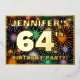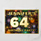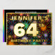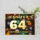 The front of this eye-catching sixty-fourth birthday party/celebration foil invitation card design features a custom name, a large number “64th”, the message “BIRTHDAY PARTY!”, and a border. The background of the front has an upbeat, colourful bursting celebratory fireworks-inspired pattern. The back features personalised details about the event, such as the date, time, place, and any other important information. Customisable invitations like these might be a fun way to invite attendees/guests to a birthday party/gathering being held to honour somebody’s 64th birthday. [~Z0000602]