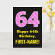 64th Birthday: Pink Stripes and Hearts "64" + Name Card