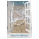 Names in beach hearts and sand with frothy ocean surf and open window view for 65th wedding anniversary