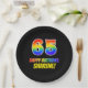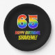 This cheerful, fun, and colourful birthday paper plate design features a large number "65" and the message "HAPPY BIRTHDAY,", both having a rainbow spectrum gradient inspired pattern colouring, along with a bold yellow editable name. The background is coloured black. Fun, customisable paper plates like this might be used at a birthday celebration being held in honour of somebody’s sixty fifth birthday. [~Z0000488]