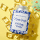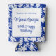 Elegant, chic design featuring a beautiful and modern white floral pattern on azure blue. Delicate blue frame and elegant fonts for birthday party details and customisation for can cooler, created as a fun and useful party supply and favour gift for your guests.