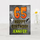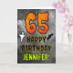 The front of this spooky and scary Halloween themed birthday greeting card design features a large number “65”. It also features the message “HAPPY BIRTHDAY,”, plus an editable name. There are also depictions of a ghost and a bat on the front. The inside features an editable birthday greeting message, or could perhaps be cleared and left blank if a message is to be written by hand instead. A customisable birthday card like this might be a fun way to acknowledge somebody’s sixty fifth birthday that also falls on Halloween (October 31st). [~Z0000547]