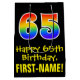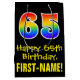 This fun, exciting, and colourful birthday-themed giftbag design features a large number "65" with a rainbow spectrum gradient inspired pattern, along with the message "Happy 65th Birthday,", and a customisable recipient name. It also has a black-coloured background. A fun gift-bag like this might be used when wrapping presents being given to somebody in celebration of their 65th birthday. [~Z0000512]