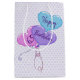 Pink, purple, and aqua heart balloon bouquet on pastel hearts on white background for 65th birthday.