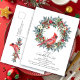 A beautiful red cardinal is framed by an elegant winter wreath. it is decorated with red flowers and berries along with pinecones. This timeless watercolor design features trendy calligraphy to give it a modern vibe. It's the perfect way to invite friends and family to a special occasion.