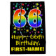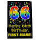 This colourful, exciting, and fun birthday themed gift bag design features a large number "66" with a rainbow spectrum gradient style pattern, along with the message "Happy 66th Birthday,", and an editable recipient name. It also has a background pattern featuring star shapes of various sizes and colours. A gift-bag like this might be used when wrapping gifts being given to somebody in celebration of their 66th birthday. [~Z0000510]