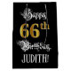 This elaborate and elegant birthday themed giftbag design features the message “Happy 66th Birthday,”, plus a personalised recipient name. Some of the message is in a luxurious script-style text. The large number “66th” features a faux/imitation gold-inspired look pattern. The background is coloured black. A gift bag like this might be used when giving a gift or present in honour of somebody’s 66th birthday. [~Z0000560]