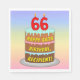 This upbeat and fun birthday paper napkin design features a cartoon-style depiction of a three-tier birthday cake having numeral-shaped candles on top showing the number “66“, along with the message “HAPPY 66TH BIRTHDAY,”, and a customisable recipient name. The background features a multi-colour pastel rainbow spectrum inspired gradient pattern. Paper napkins like these might be used when celebrating somebody’s sixty sixth birthday. [~Z0000623]