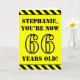 The front of this bold and fun birthday-themed greeting card design features a personalized name and the message "YOU’RE NOW 66 YEARS OLD!" in black stencil inspired text on a yellow colored background. The front also features an eye-catching yellow and black stripes pattern at the top and bottom edges. The inside features a custom birthday greeting message, or could perhaps be cleared and left blank if a message is to be written by hand instead. A customizable birthday card like this might be a fun way to acknowledge somebody’s sixty sixth birthday. [~Z0000413]
