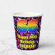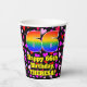 This fun and happy birthday-themed paper cup design features a large number “66” having a rainbow spectrum gradient inspired pattern. It also features the message “Happy 66th Birthday,”, and an editable name. The background features a pattern of heart shapes with colours like pink, purple, and red. Joyful, happy paper cups like this might be fun to use at a birthday party being held to celebrate somebody’s 66th birthday. [~Z0000548]