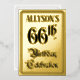 The front of this luxurious and opulent sixty-sixth birthday celebration foil announcement/invitation card design features the message “66th Birthday Celebration” in elaborate script-style text. It also features an editable name. The back features personalised details about the event, such as the date, time, place, and any other important information. Elegant, fancy, personalised invitations like these might be used to invite guests to a birthday party/celebration being held to celebrate somebody’s sixty-sixth birthday. [~Z0000596]