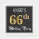 This fancy and ornate birthday paper napkin design features an editable name and the message “66th Birthday Party”. The large number “66th” has a faux/imitation gold-inspired coloring pattern, and the words “Birthday Party” are in elegant script-style text. The background is colored black by default (although it can be customized). Opulent, luxurious paper napkins like this might be useful to have at a birthday celebration being held to celebrate somebody’s 66th birthday. [~Z0000565]