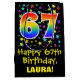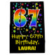 This exciting, fun, and vibrant birthday gift bag design features a large number "67" with a rainbow spectrum gradient style pattern, along with the message "Happy 67th Birthday,", and a customisable recipient name. It also has a colourful background pattern featuring star shapes of various sizes. A birthday themed gift bag like this might be a fun way to wrap a gift or present being given to celebrate somebody’s 67th birthday. [~Z0000510]