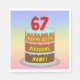 This upbeat and cheerful birthday paper napkin design features a cartoon-style depiction of a three-tier birthday cake having numeral-shaped candles on top showing the number “67“, along with the message “HAPPY 67TH BIRTHDAY,”, and a personalised recipient name. The background features a multi-colour pastel rainbow spectrum inspired gradient pattern. Birthday themed paper napkins like these might be used at a party celebrating somebody’s sixty seventh birthday. [~Z0000623]