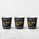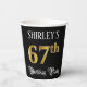 This fancy and luxurious birthday paper cup design features a personalised name and the message “67th Birthday Party”. The large number “67th” has a faux/imitation gold-inspired colouring pattern, and the words “Birthday Party” are in elegant script-style text. The background is coloured black by default (although it can be customised). Ornate, opulent paper cups like this might be useful to have at a birthday celebration being held in celebration of somebody’s 67th birthday. [~Z0000567]