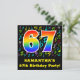 The front of this fun, exciting, and vibrant birthday party invitation design features a large number "67" having a rainbow spectrum gradient inspired pattern. It also features a personalised name and the message "67th Birthday Party!". Part of the background features a fun pattern of various music notes and symbols having a variety of colours and sizes. The back features customised details pertaining to the event that the potential guests are being invited to. Joyful, customised birthday party invitation cards like this might be sent to potential guests of a celebratory gathering being held to honour a musician’s, a song composer’s, a singer’s, or somebody else’s 67th birthday. [~Z0000427]
