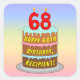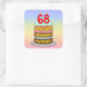 This fun and upbeat birthday themed square sticker design features a cartoon-style depiction of a three-tier birthday cake having number-shaped candles on top showing the age “68“, along with the message “HAPPY 68TH BIRTHDAY,”, and a personalised recipient name. The background has a multicolored pastel rainbow spectrum inspired gradient pattern. Stickers like these might be used or given out at a birthday party held in celebration of somebody’s 68th birthday, or perhaps used when preparing presents/gifts or invitations for such an event. [~Z0000624]