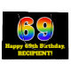 This fun and vibrant birthday-themed gift bag design features a large number "69" with a rainbow spectrum gradient inspired pattern, along with the message "Happy 69th Birthday,", and a personalised name. The background is coloured black. A colourful birthday themed gift-bag like this might be a fun way to wrap a gift or present being given to somebody who is celebrating their 69th birthday. [~Z0000521]