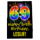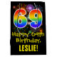 This exciting, colourful, and fun birthday themed giftbag design features a large number "69" with a rainbow spectrum gradient inspired pattern, along with the message "Happy 69th Birthday,", and a custom recipient name. It also has a colourful background pattern inspired by bursting celebratory fireworks. A fun gift-bag like this might be used when wrapping presents being given to somebody in celebration of their 69th birthday. [~Z0000509]