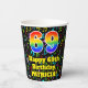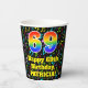 This cheerful and exciting music-themed birthday paper cup design features a large number “69” having a rainbow spectrum gradient inspired pattern. It also features the message “Happy 69th Birthday,”, and a personalised name. The background features a multicolored pattern of various music notes and symbols having a variety of sizes and colours. Colourful, vibrant paper cups like this might be fun to use at a birthday party being held in celebration of somebody’s 69th birthday. [~Z0000541]