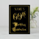 The front of this fancy and opulent foil sixty-ninth birthday celebration/party invitation design features the message “69th Birthday Celebration” in luxurious script-style text. It also has an editable name. The background of the front is coloured black by default (although it can be customised to a different colour). The back features personalised details about the event, such as the date, time, location, and any other relevant information. Elegant, ornate, editable invitations like these might be used to invite guests to a birthday party being held in celebration of somebody’s sixty-ninth birthday. [~Z0000589]