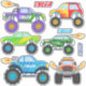 Six cool monster trucks in various colours for kids with flames and personalised blue, red and white names.
