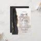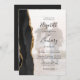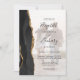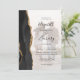 This elegant wedding design features a vertical photo of the couple softened with a white screen to highlight the text overlay. The left-hand edge features a black watercolor agate border trimmed with faux gold glitter. The customizable black text combines handwriting, copperplate and italic fonts. The reverse side features a matching black and gold agate edge. The reverse side provides spaces for 5 additional photos (3 horizontal 1 square and 1 vertical) and room for your wedding website URL or other brief message.