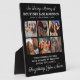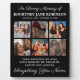 Personalised photo memorial plaque featuring 6 precious pictures of your lost loved one, the text "in loving memory", their name, birth/death dates, and the remembrance saying "your presence we miss, your memory we treasure, loving you always, forgetting you never".