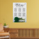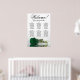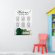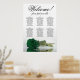 This beautiful wedding seating chart has six tables, each accommodating 10 guests, totalling 60 guests. The chart features a romantic design, showcasing a single long-stemmed deep emerald green coloured rose delicately resting on its side and reflecting in a serene pool of water. The chart's title, rendered in elegant script calligraphy, warmly invites guests with "Welcome! Please find your table," while leaving sufficient space at the bottom for the couple's names and wedding date. This seating chart serves as a wonderful and practical way to greet your guests and assist them in finding their designated seats at the reception, exuding an air of charm and sophistication.