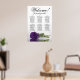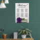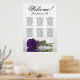 This beautiful wedding seating chart has six tables, each accommodating 10 guests, totalling 60 guests. The chart features a romantic design, showcasing a single long-stemmed deep royal purple rose delicately resting on its side and reflecting in a serene pool of water. The chart's title, rendered in elegant script calligraphy, warmly invites guests with "Welcome! Please find your table," while leaving sufficient space at the bottom for the couple's names and wedding date. This seating chart serves as a wonderful and practical way to greet your guests and assist them in finding their designated seats at the reception, exuding an air of charm and sophistication.