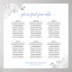 This 6 table seating chart is both simple and elegant with dark grey and light blue text on a white background and lacy silver faux foil floral filigree in the corners. The title reads "please find your table" in an elegant script calligraphy. Sophisticated and chic. Includes table assignments for 60 guests with 10 seats per table.