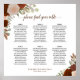 This 6 table wedding seating chart features a beautiful hand painted watercolor design with roses, flowers, and autumn foliage in shades of rust orange, coral peach, and burnt umber. It has space for 60 guests with 10 seats at each table, with an elegant script calligraphy title, and space for the names of the couple and wedding date below. Wonderful way to add a touch of boho chic fall colours to your wedding reception while making it easy for your guests to find their seats.