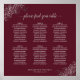 This 6 table seating chart is both simple and elegant with gray text on a burgundy background and lacy silver faux foil floral filigree in the corners. The title reads "please find your table" in an elegant script calligraphy. Sophisticated and chic. Includes table assignments for 60 guests with 10 seats per table.