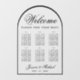 A simple transparent wedding seating chart inside a modern arch frame. The text and the frame are black. The Welcome and the names are written in an elegant calligraphy.