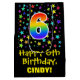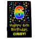 This colourful, vibrant, and exciting birthday giftbag design features a large number "6" with a rainbow spectrum gradient inspired pattern, along with the message "Happy 6th Birthday,", and a custom recipient name. It also has a background pattern featuring star shapes of various sizes and colours. A fun gift bag like this might be used when wrapping presents being given to somebody in celebration of their sixth birthday. [~Z0000510]