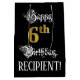 This fancy and opulent birthday-themed giftbag design features the message “Happy 6th Birthday,”, and a customisable recipient name. Part of the message is in a luxurious script-style text. The large number “6th” features a faux/imitation gold-inspired look pattern. The background is coloured black. A birthday themed gift bag like this might be used when giving a gift or present in celebration of somebody’s sixth birthday. [~Z0000560]