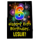 This fun, exciting, and colourful birthday themed gift bag design features a large number "6" with a rainbow spectrum gradient inspired pattern, along with the message "Happy 6th Birthday,", and a customisable recipient name. It also features a colourful background pattern inspired by the look of bursting celebratory fireworks. A birthday themed gift bag like this might be a fun way to wrap a gift or present being given to celebrate somebody’s sixth birthday. [~Z0000509]