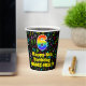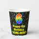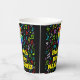 This exciting and cheerful music themed birthday paper cup design features a large number “6” with a rainbow spectrum gradient inspired pattern, along with the message “Happy 6th Birthday,”, and an editable name. The background features an exciting and colourful pattern of various music notes and symbols of different colours and sizes. Colourful, vibrant paper cups like this might be fun to have at a birthday celebration being held to celebrate somebody’s sixth birthday. [~Z0000541]