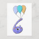A cartoon of a monster in the shape of a number 6. Designed for a kids 6th birthday. This number 6 birthday character is in purple with light orange dots and three colourful balloons.