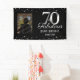 Elegant black 70th birthday banner with adjustable Happy Birthday and Custom Name Text. Pick your favorite photo and upload! Faux foil silver confetti and 70 number.